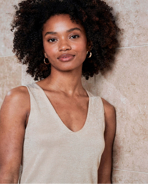 Regata com decote em V na frente e atrás. Design de silhueta reta com acabamentos limpos e estrutura simples. Feito de tecido fino e simples com fio de lurex. Projetado em Barcelona.
