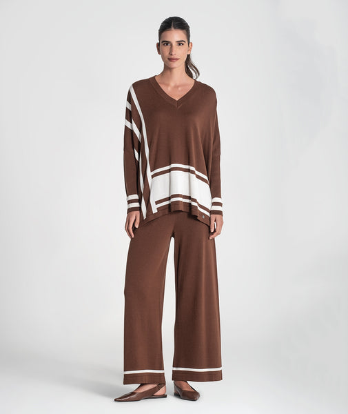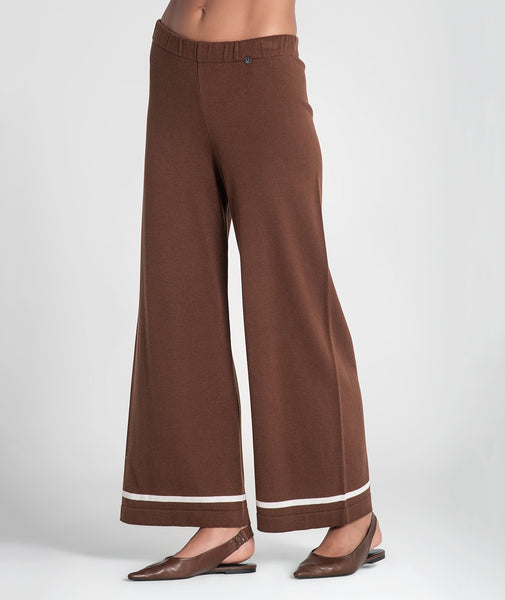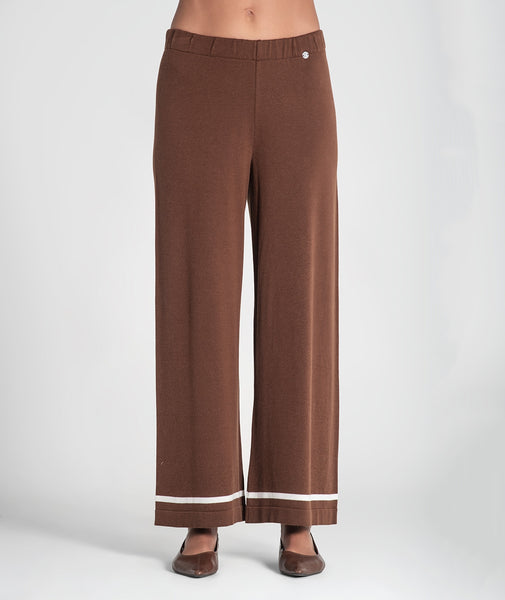 Calça básica com barra listrada. Cós ajustável com elástico.