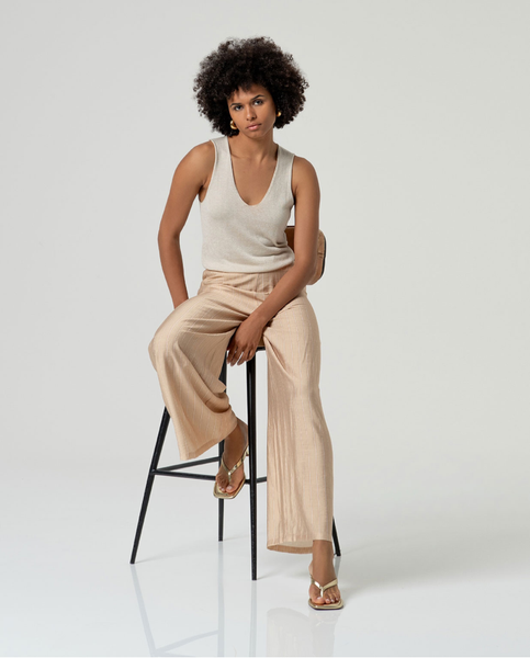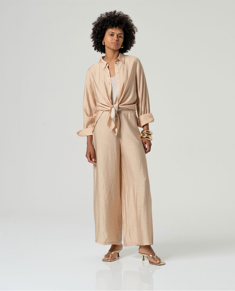 Calças longas de cintura alta com uma silhueta larga. Design com cós elástico e linha limpa na frente. Perna larga e reta com queda fluida. Comprimento até o tornozelo. Projetado em Barcelona.