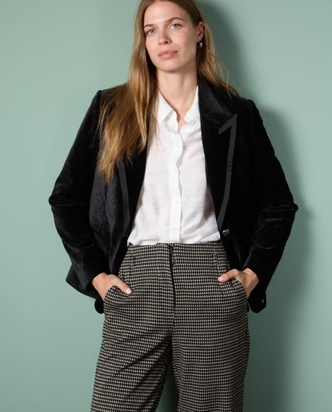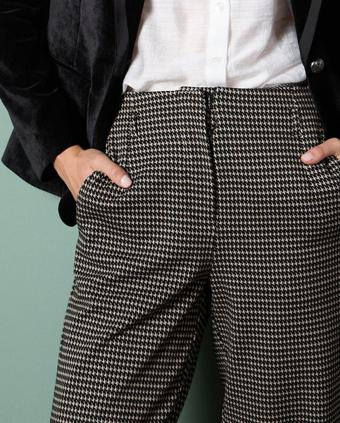 Calças de corte direito com estampado houndstooth, fecho invisível à frente com botão e fecho de correr. Com bolsos laterais e um tecido elástico que se adapta ao movimento sem perder a forma. Uma peça de vestuário versátil, ideal para um look casual chique ou de escritório.