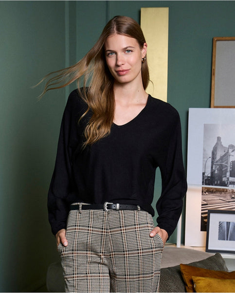 Camisola de viscose fina com decote em V muito aberto e mangas japonesas. O seu drapeado suave e o corte fluido proporcionam conforto e movimento, ideal para looks casuais com um toque elegante.