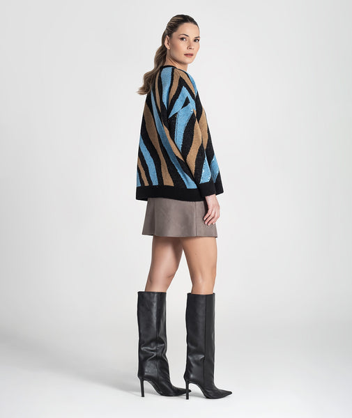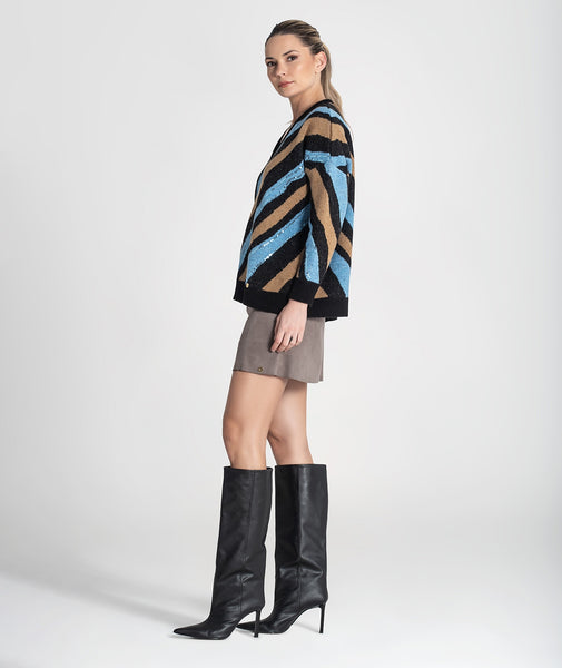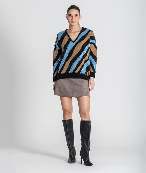 Suéter com estampa animal em jacquard de zebra e bordado de lantejoulas.