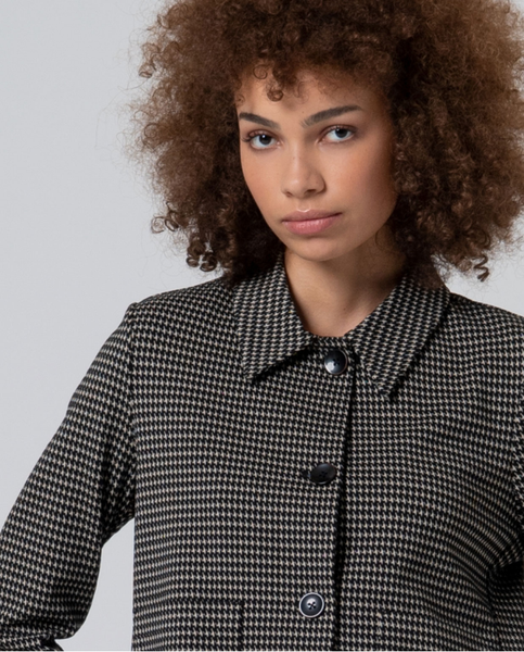 Casaco curto com estampado clássico houndstooth, sem forro e com bolsos funcionais. Fabricado num tecido elástico que combina poliéster, viscose e elastano para maior conforto. Um design sofisticado e intemporal, perfeito por si só ou como parte de um look total.