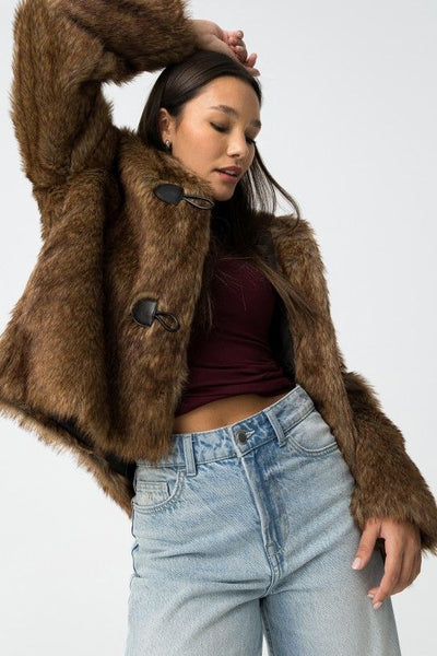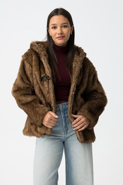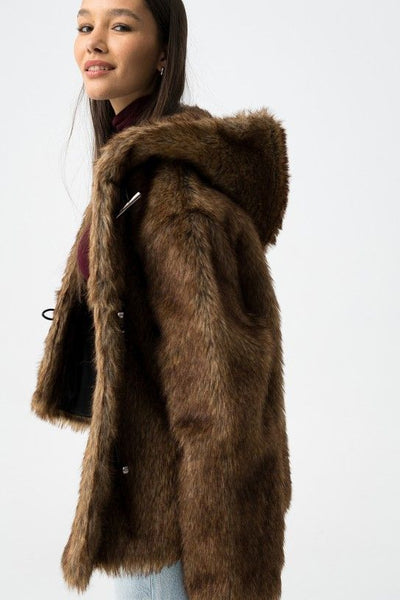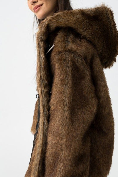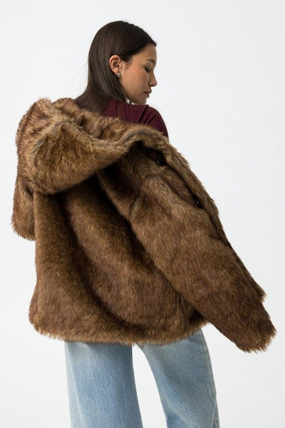 Casaco relaxed fit de pelo sintético com dois bolsos, capuz, fecho de alternância e manga longa.