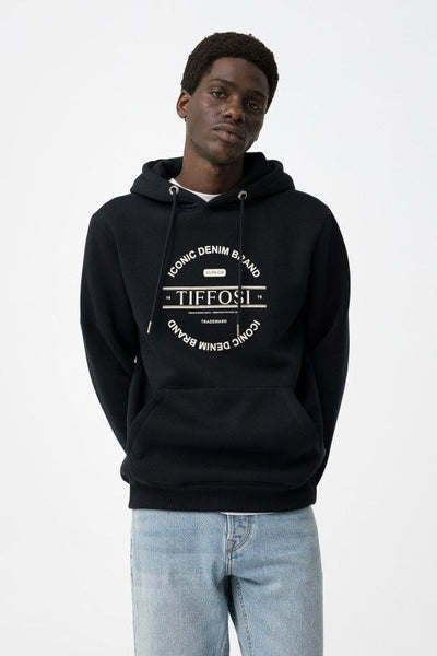Moletom estampado de manga comprida e decote redondo com capuz. Bolso canguru frontal e detalhes de costura no peito.