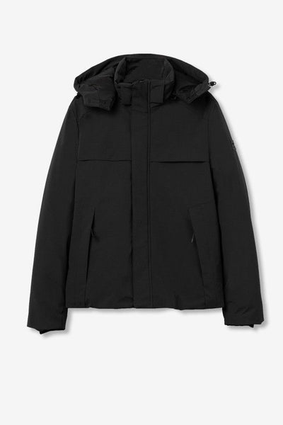 Casaco regular fit com interior acolchoado, resistente à água e ao vento. Com dois bolsos frontais, capuz removível e fecho de correr reforçado com botões. Gola alta e manga longa com rib interno.