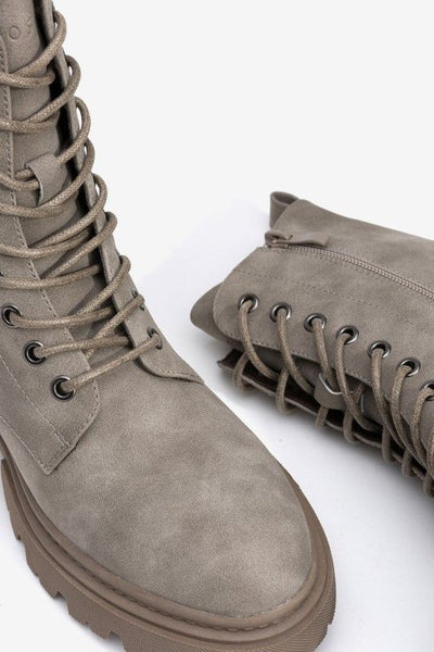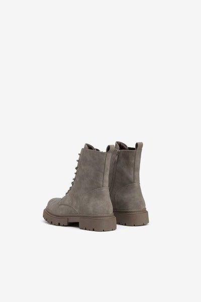 Botim efeito camurça com fecho de cordão e zíper lateral. Sola com rasto. Puxador traseiro.100% POLYURETHANE
